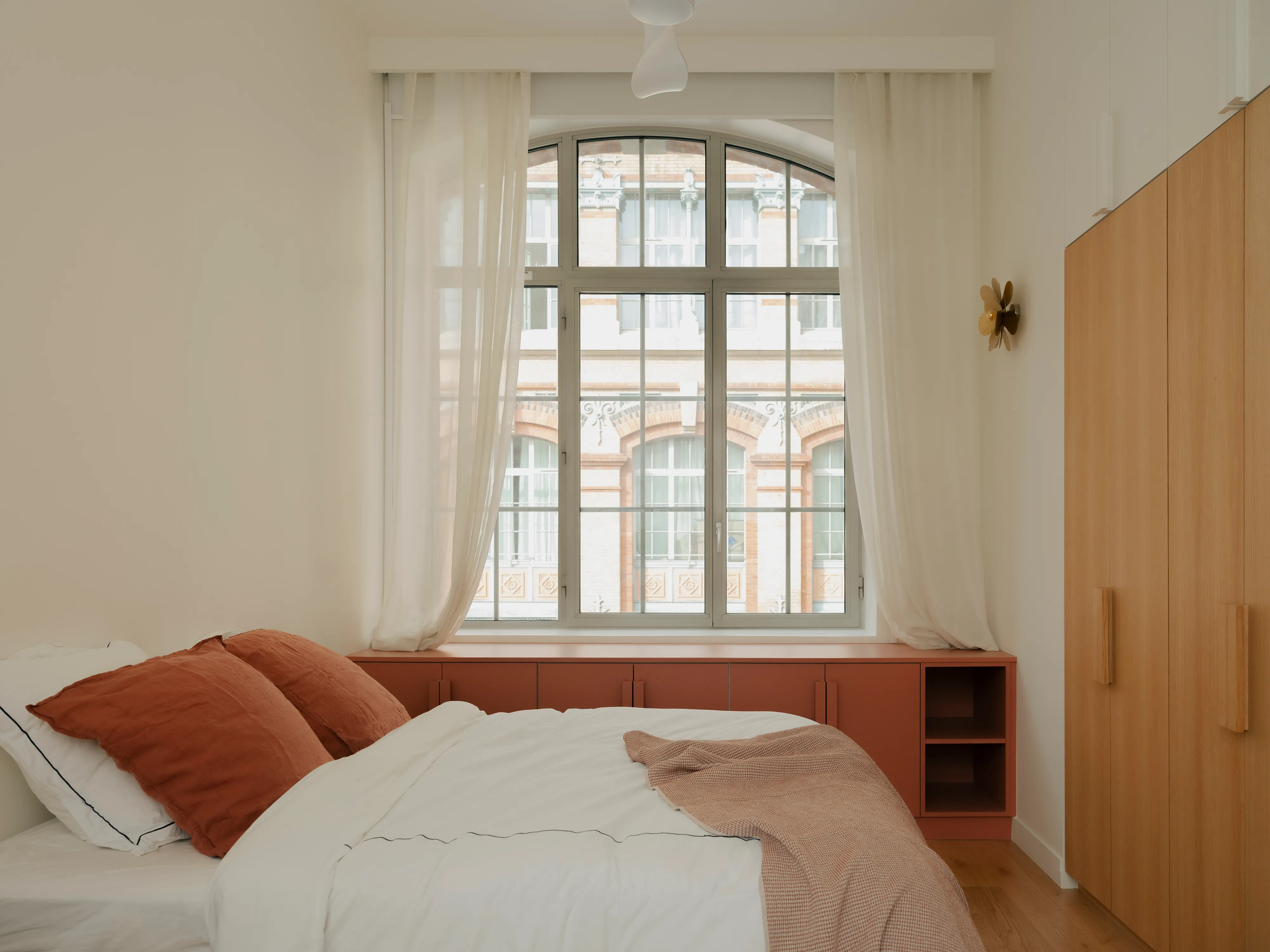 Dans ce 34m² parisien, chaque centimètre compte. La chambre a été pensée pour offrir un maximum de confort et de rangement dans un espace compact, avec une palette douce et un éclairage soigné.